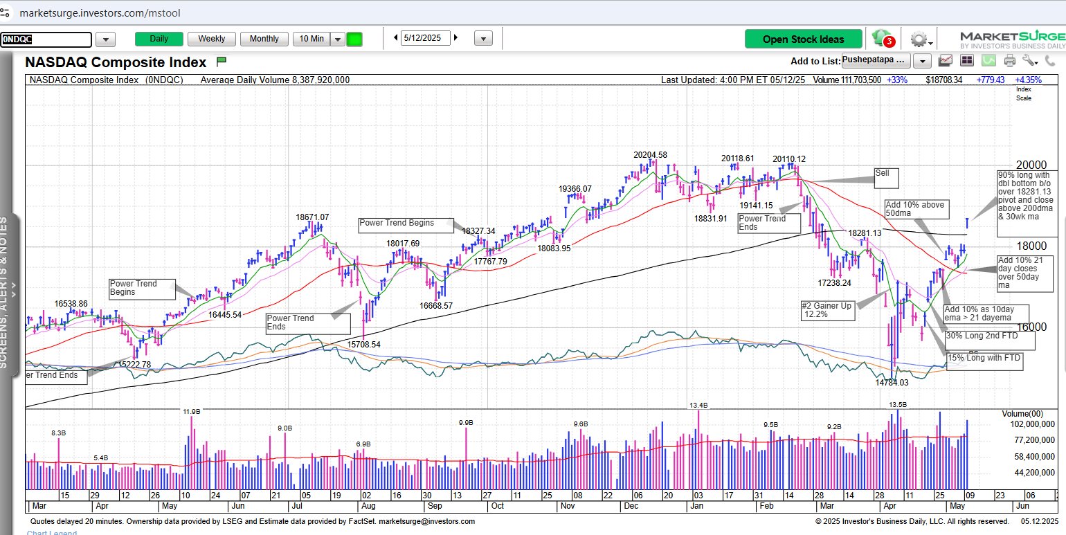 Nhưng khi tuần trôi qua, cuối cùng chúng tôi đã giảm dần vị thế và cuối cùng thoát ra (điểm đánh dấu số 9). Tại sao? Không phải vì chúng tôi tiêu cực về thị trường. Trên thực tế, chúng tôi đã bắt đầu sử dụng margin cho danh mục mô hình của mình. Chúng tôi cũng đang xem xét một xu hướng tăng mạnh (power trend) bắt đầu cho Nasdaq Composite và S&P 500, điều này báo hiệu triển vọng tốt.