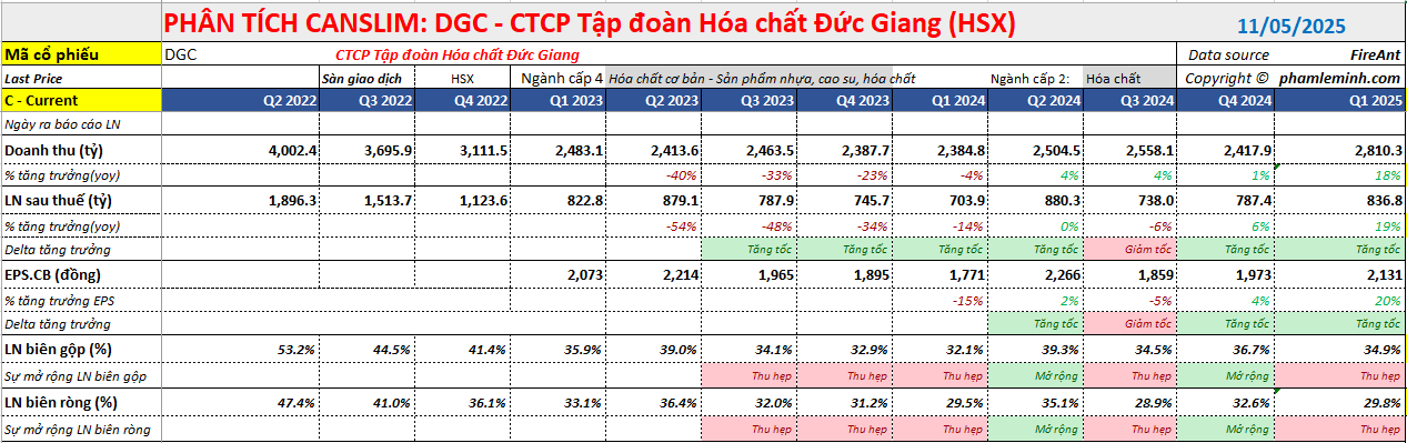 Elibook Team cho rằng, DGC là cổ phiếu phục hồi từ khó khăn khi đang có sự tăng tốc trong tăng trưởng doanh thu 3 quý gần nhất, từ +4% lên +18% yoy, và lợi nhuận đã chấm dứt đà giảm tốc, để phục hồi lên mức tăng trưởng +23% yoy trong quý 1.2025.