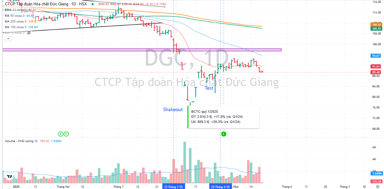 Cổ phiếu đang cố gắng tạo đáy vào ngày 9.4.2025 và phục hồi hướng về MA50 ngày, hiện vẫn đang nằm dưới đường trung bình di động quan trọng này. Chưa có khuyến nghị giao dịch ở DGC.