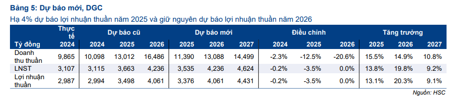 Theo đó, lợi nhuận ròng của DGC được dự báo sẽ tăng trưởng với tốc độ CAGR 3 năm (2024-2027) là 14%.