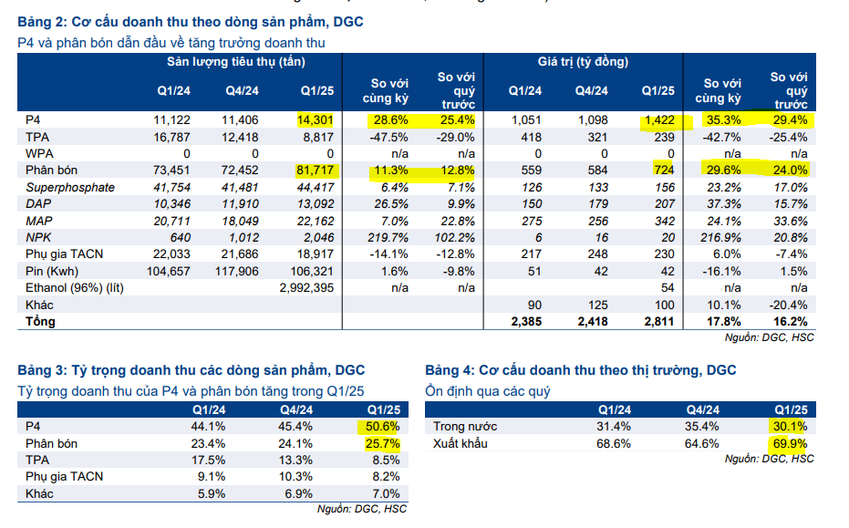 DGC đã công bố kết quả kinh doanh quý 1/2025 tích cực và sát với dự báo của HSC. Doanh thu đạt 2,810 tỷ đồng (+18% YoY, +16% QoQ), trong khi lợi nhuận ròng tăng trưởng ấn tượng 20% yoy và 8% QoQ, đạt 809 tỷ đồng. Động lực tăng trưởng chính đến từ nhu cầu mạnh mẽ đối với sản phẩm P4 và phân bón, cùng với biên lợi nhuận được cải thiện.
