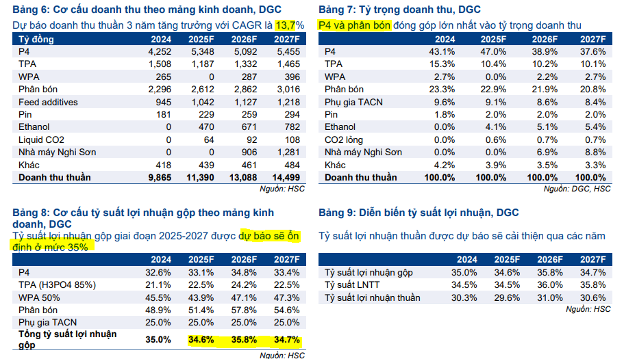 HSC chưa đưa các dự án này vào mô hình dự báo lợi nhuận hiện tại, nhưng nếu được thông qua, chúng sẽ tạo ra rủi ro tăng đáng kể cho cả định giá và dự báo lợi nhuận của DGC trong tương lai.