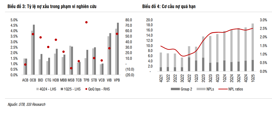 Mặc dù chất lượng tài sản có sự suy giảm nhẹ trong Q1/2025 với nợ xấu và nợ Nhóm 2 lần lượt tăng 9.2% và 7.3% so với đầu năm, tỷ lệ nợ xấu tăng lên 2.51% (so với 2.4% cuối Q4/2024), STB vẫn đặt mục tiêu xử lý khoảng 1 nghìn tỷ đồng nợ xấu trong năm 2025, giúp duy trì tỷ lệ nợ xấu ổn định ở mức 2.4%. Sang năm 2026, tỷ lệ nợ xấu dự kiến giảm còn 2.2% nhờ quá trình đẩy mạnh xử lý nợ.