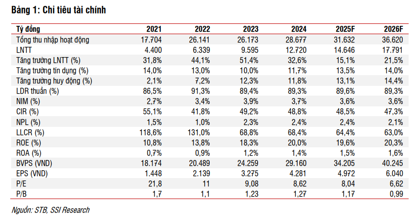 SSI Research duy trì khuyến nghị KHẢ QUAN đối với cổ phiếu STB, với giá mục tiêu 1 năm là 47,600 đồng/cổ phiếu (tăng từ 41,900 đồng). Dự báo lợi nhuận trước thuế (LNTT) của STB sẽ đạt 14,600 tỷ đồng trong năm 2025 (+15% YoY) và tăng lên 17,800 tỷ đồng (+21.5% YoY) vào năm 2026. Động lực chính cho tăng trưởng lợi nhuận đến từ:
