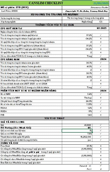 Bảng CANSLIM checklist cho thấy STB đỗ nhiều tiêu chí quan trọng. Trong 3 quý gần nhất, STB đều có tốc độ tăng trưởng lợi nhuận hai con số lớn là: +35%; +39% và +38% yoy. Đồng thời, STB đã có 3 năm tăng tốc trong tăng trưởng lợi nhuận với hai con số lớn là +48%, +53% và +31% yoy.