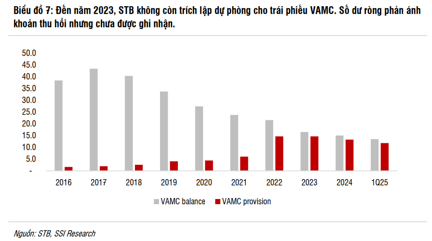 Trong Q1/2025, số dư trái phiếu VAMC đã giảm 1,500 tỷ đồng nhờ nỗ lực thu hồi (không liên quan đến KCN Phong Phú), giúp STB hoàn nhập dự phòng tương ứng. Tuy nhiên, dự phòng chung trong Q1/2025 tăng mạnh 1,400 tỷ đồng. SSI Research cho rằng sẽ có khoảng 1,200 tỷ đồng được hoàn nhập trong Q2/2025.