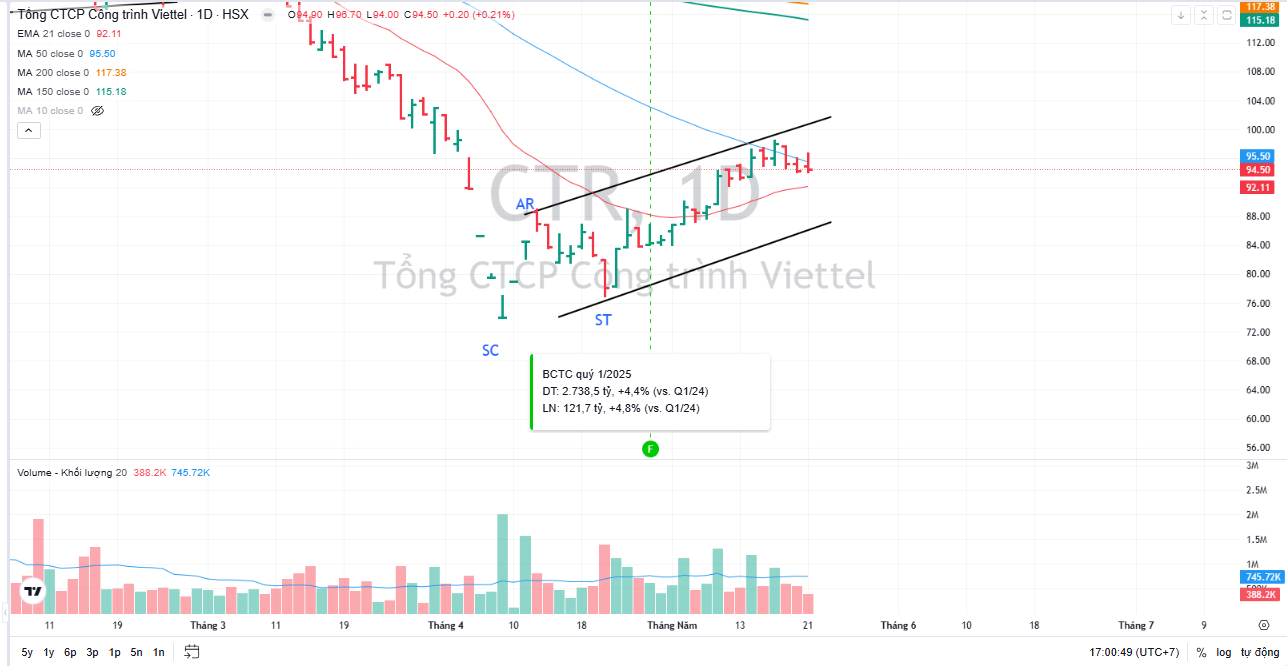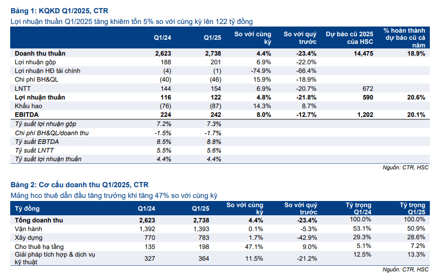 Trong Quý 1/2025, CTR ghi nhận lợi nhuận thuần đạt 122 tỷ đồng (+5% YoY) trên doanh thu 2,738 tỷ đồng (+4% YoY), hoàn thành 21% kế hoạch năm của doanh nghiệp và 19% dự phóng của MBS.