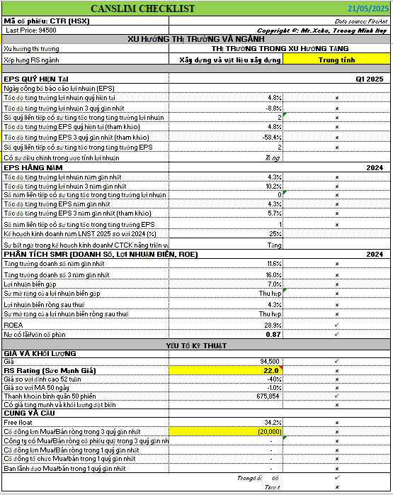 Trên đồ thị, RS của CTR chỉ là 22, nằm trong số cổ phiếu hoạt động kém trên thị trường. Cổ phiếu chưa thể phục hồi về mức trước cú giảm do chiến tranh thương mại vào đầu tháng 4. CTR đang tích lũy quanh MA50 ngày. Elibook vì thế chưa có khuyến nghị giao dịch tại thời điểm hiện tại.