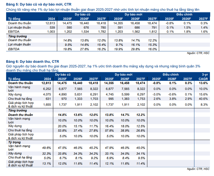 - Trong khi đó, HSC vẫn giữ nguyên dự báo Công ty sẽ lắp đặt thêm 3,000 trạm BTS 4G (macro cell) trong năm 2025, trong khi dự báo Công ty sẽ lắp đặt 1,000 trạm BTS 5G (small cell) trong năm 2025 (trước đó HSC dự báo không có trạm BTS 5G nào được lắp đặt trong năm nay) và 5,000 trạm BTS 5G mỗi năm trong năm 2026-2027 (không đổi). HSC cho rằng với việc đẩy mạnh thương mại hóa mạng 5G, cùng với sự đôn đốc của Chính phủ dẫn đến hoạt động đầu tư vào các trạm BTS 5G của CTR được triển khai nhanh hơn dự báo trước đó.