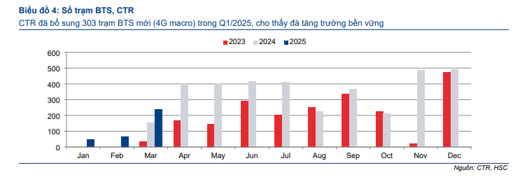 Lưu ý trong quý 1, doanh thu mảng cho thuê hạ tầng tăng 47%yoy đạt 198 tỷ đồng. CTR đã lắp đặt thêm 303 trạm BTS, nâng tổng số trạm BTS lên 10,350 trạm vào cuối Q1/2025.