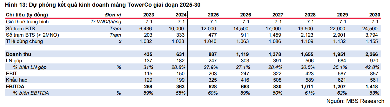 - Đẩy mạnh trạm 5G: MBS dự kiến CTR sẽ xây dựng thêm 2,000 trạm BTS trong năm 2025 (giảm so với 2024 do Viettel lắp đặt thiết bị 5G trên các trạm sẵn có). Tuy nhiên, từ 2026-2030, Viettel cần triển khai thêm ít nhất 45,000 trạm 5G để phủ sóng hiệu quả, với giả định 50% sẽ do CTR triển khai và cho thuê lại. Các nhà mạng lớn khác như VNPT và MobiFone cũng đặt mục tiêu lắp đặt hàng chục nghìn trạm 5G mới trong năm 2025. CTR đặt mục tiêu giành 50% gói thầu xây dựng hạ tầng 5G của Viettel (7,500-10,000 trạm BTS) và chủ động đấu thầu với các nhà mạng khác.