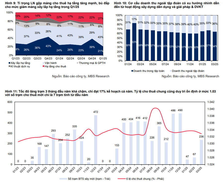 Mặc dù tốc độ tăng trưởng ở mức một chữ số, các mảng dịch vụ và cho thuê hạ tầng (towerco) đóng góp tích cực, bù đắp cho sự chững lại ở mảng vận hành khai thác và xây lắp. Biên lợi nhuận gộp cải thiện 0.2 điểm phần trăm, chủ yếu nhờ đóng góp lớn hơn từ mảng cho thuê hạ tầng có biên lợi nhuận cao.