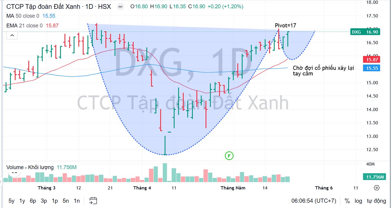 Trên đồ thị, DXG đang có RS=82, nằm trong số các cổ phiếu hoạt động khá tốt trên thị trường. Sóng ngành BĐS Dân Cư đang dần hình thành. Tuy nhiên, DXG đang trở về vùng đỉnh kháng cự quanh 17,000 và có khả năng cần điều chỉnh khi VN-Index cũng gặp kháng cự quanh 1,300 điểm. Quá trình điều kiến tạo nên một tay cầm mới được hình thành.