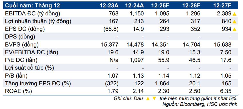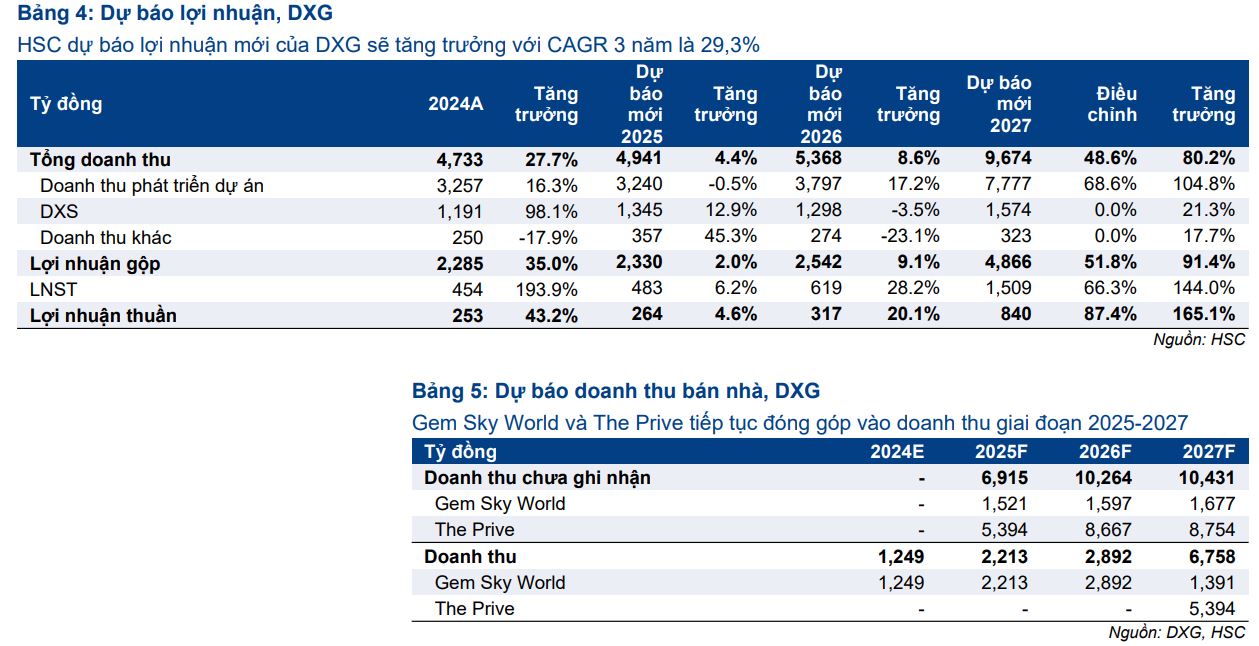 HSC gần như giữ nguyên dự báo lợi nhuận thuần cho năm 2025-2026 lần lượt là 264 tỷ đồng (+4,6% YoY) và 317 tỷ đồng (+20.1% YoY), chủ yếu nhờ doanh thu ghi nhận từ dự án Gem Sky World. Tuy nhiên, cho năm 2027, HSC điều chỉnh tăng mạnh 87.4% dự báo lợi nhuận thuần lên 840 tỷ đồng (+165.1% YoY) và tăng 48.6% dự báo doanh thu lên 9,700 tỷ đồng (+80.2% YoY). Sự tăng trưởng đột biến này chủ yếu nhờ vào việc tăng giả định giá bán bình quân và tỷ lệ hấp thụ cao hơn tại thời điểm mở bán dự án The Prive.