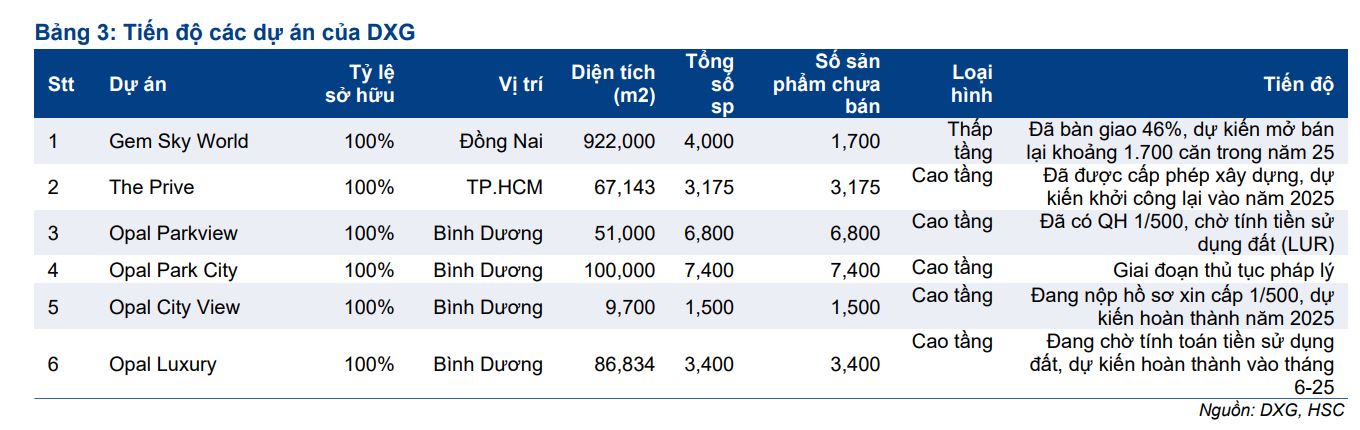 - Tốc độ phục hồi thị trường: HSC thận trọng hơn về tốc độ phục hồi của thị trường, đặc biệt tại các tỉnh miền Nam như Đồng Nai (nơi có dự án Gem Sky World), khi nguồn cung và mặt bằng giá có dấu hiệu chững lại trong Q1/2025. Dự báo lợi nhuận thuần 2025 của HSC vẫn thấp hơn đáng kể so với kế hoạch kinh doanh của DXG.
