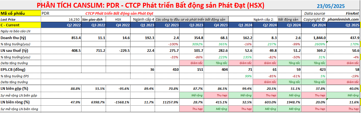 Trong quý 1/2025, PDR công bố lợi nhuận ròng đạt 78 tỷ đồng (tăng 47.9% yoy) trên doanh thu 438 tỷ đồng (tăng gần 3 lần so với cùng kỳ). Tuy nhiên, kết quả này thấp hơn kỳ vọng của HSC do tỷ lệ hấp thụ và doanh thu ghi nhận tại dự án Quy Nhơn Iconic (tên cũ: Bắc Hà Thanh) thấp hơn dự kiến.