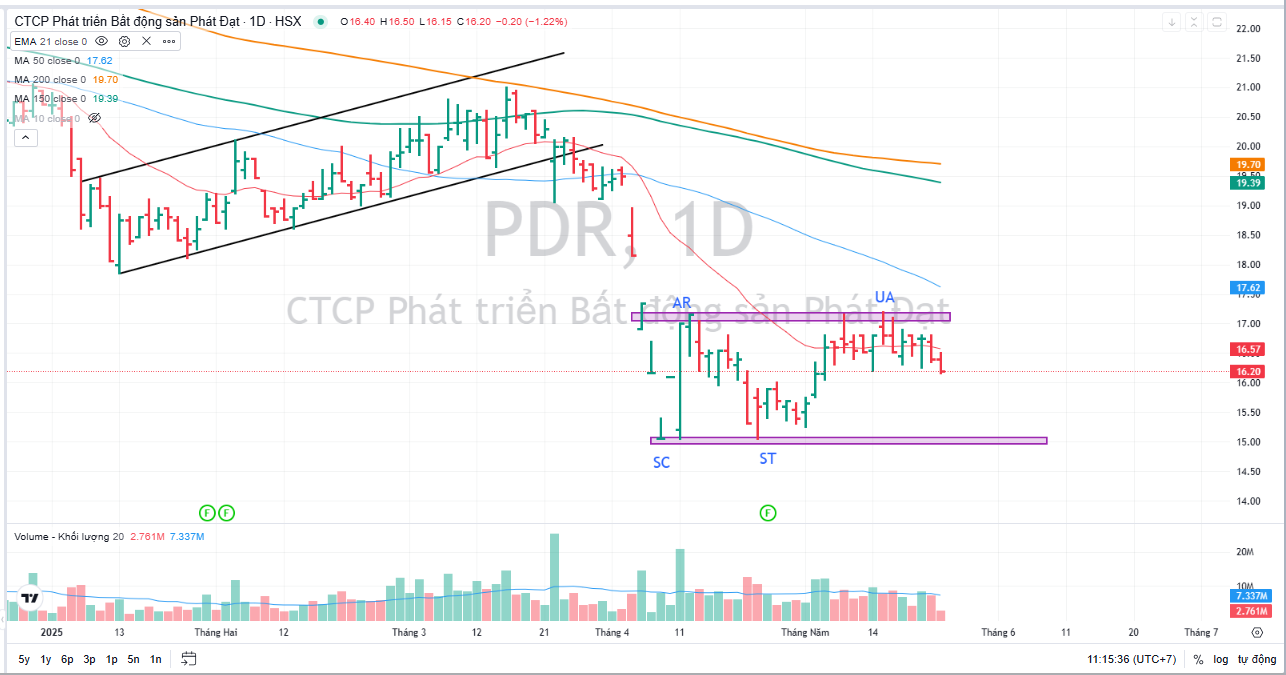 Elibook Team không khuyến nghị giao dịch ở PDR khi cổ phiếu hoạt động kém với RS thấp (20). PDR đang cố gắng tích lũy trong kênh giá đi ngang ở vùng đáy.