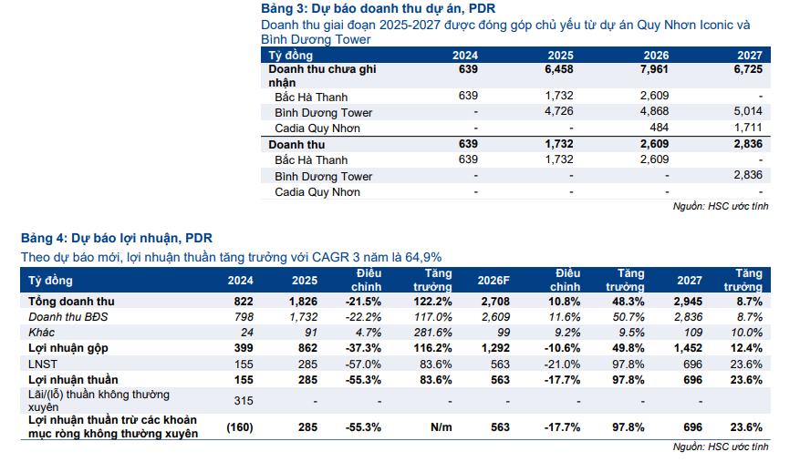 Tuy nhiên, HSC cũng đưa ra dự báo lần đầu cho năm 2027 với lợi nhuận ròng đạt 696 tỷ đồng (tăng trưởng 23.6%), nhờ vào việc bắt đầu ghi nhận doanh thu tại dự án Bình Dương Tower. Mặc dù các dự báo mới cho năm 2025-2026 thấp hơn nhiều so với bình quân dự báo thị trường, HSC nhận định lợi nhuận thuần của PDR dự kiến sẽ tăng trưởng với tốc độ CAGR 3 năm là 64.9%.