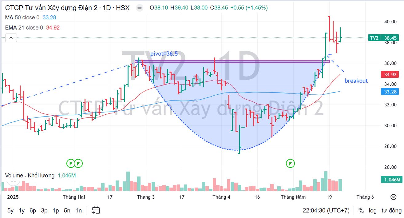 Trên đồ thị, RS (sức mạnh giá tương đối) của TV2 là 95, nằm trong số các cổ phiếu hoạt động tốt trên thị trường. Sóng ngành điện xuất hiện sau khi Quy Hoạch Điện VIII sửa đổi được thông qua vào giữa tháng 5.