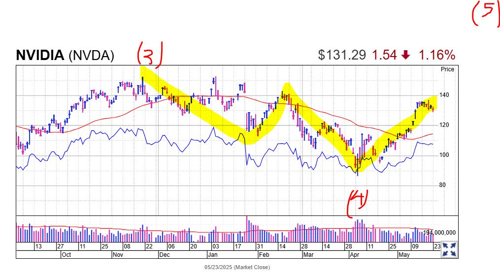 Trong khi đó, cổ phiếu Nvidia đã hình thành một Hai Đáy (W) với điểm mua là 143.44, theo biểu đồ IBD MarketSurge. Nvidia kết thúc phiên giao dịch thông thường ngày 22 tháng 5 ở mức 132.83