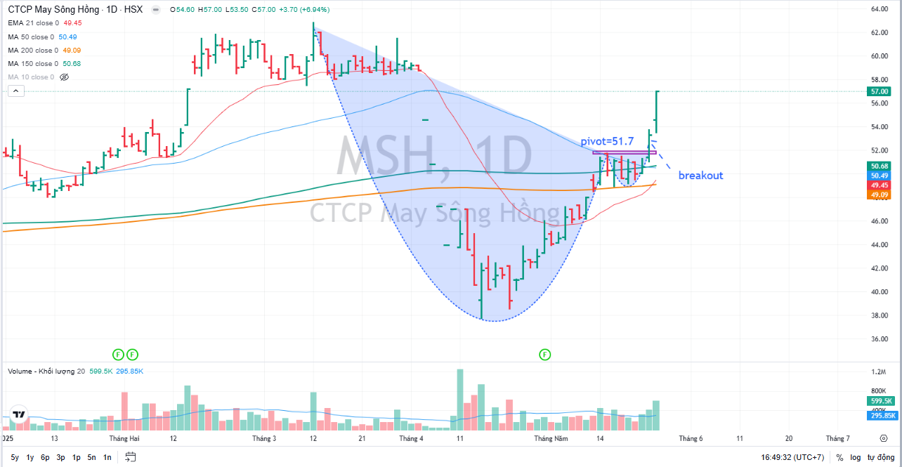 Ngày 23.5.2025, MSH breakout mẫu hình Chiếc Cốc Tay Cầm, vượt qua điểm mua 51,700. Tuy nhiên, tay cầm nằm ngay chính giữa nền giá nên không mạnh. Elibook Team cho rằng, nên thận trọng với khả năng xây lại tay cầm mới. Vào thời điểm này, điểm mua breakout vẫn chưa hoạt động tốt.