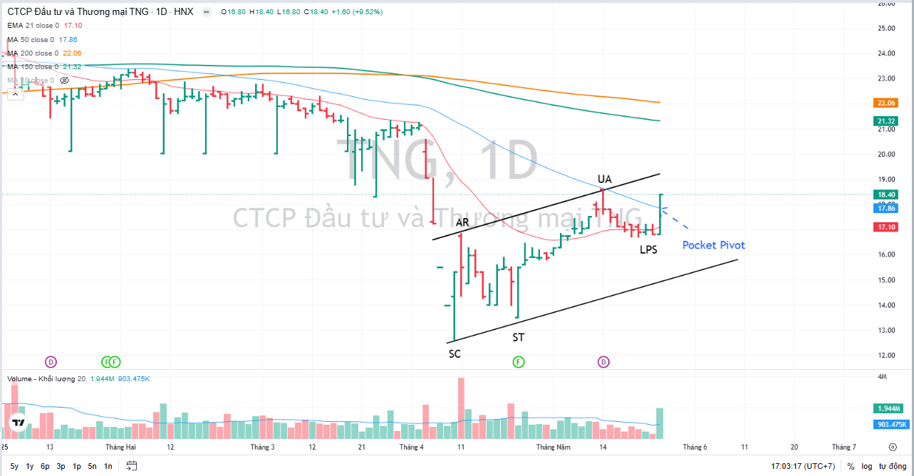 Trên đồ thị, TNG có RS là 15, nằm trong số các cổ phiếu hoạt động kém trên thị trường. TNG đang tích lũy trong một khung giá hướng lên, quanh MA50 ngày. Ngày 26.5.2025, TNG có điểm mua Pocket Pivot