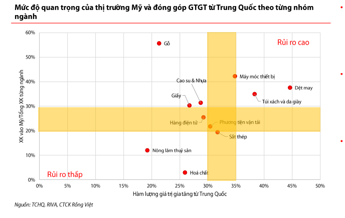 Về vấn đề thuế quan, theo VDSC, mặc dù có những tín hiệu tích cực, Việt Nam vẫn phải đối mặt với thách thức trong việc đảm bảo nguồn gốc xuất xứ của hàng hóa. Các ngành như đồ gỗ, cao su & nhựa, máy móc thiết bị, dệt may, túi xách & giày dép hiện có hàm lượng giá trị gia tăng từ Trung Quốc khá cao (trên 30%) và có nguy cơ bị áp thuế cao.