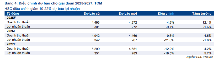 Trước những thách thức này, HSC đã điều chỉnh giảm 10-22% dự báo lợi nhuận ròng của TCM giai đoạn 2025-2027. Cụ thể, lợi nhuận thuần dự kiến giảm 2% mỗi năm trong năm 2025 và 2026 (xuống lần lượt 272 tỷ đồng và 267 tỷ đồng), sau đó tăng 5% trong năm 2027 đạt 283 tỷ đồng. Nhìn chung, tốc độ CAGR lợi nhuận thuần 3 năm chỉ đạt 1%.