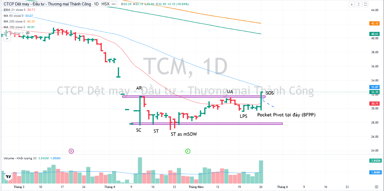 Mặc dù vậy, dòng tiền đang đánh giá cao khả năng phục hồi của nhóm dệt may trong đó có TCM. Trên đồ thị ngày 26.5.2025, TCM có điểm mua BFPP (điểm mua Pocket Pivot tại đáy).