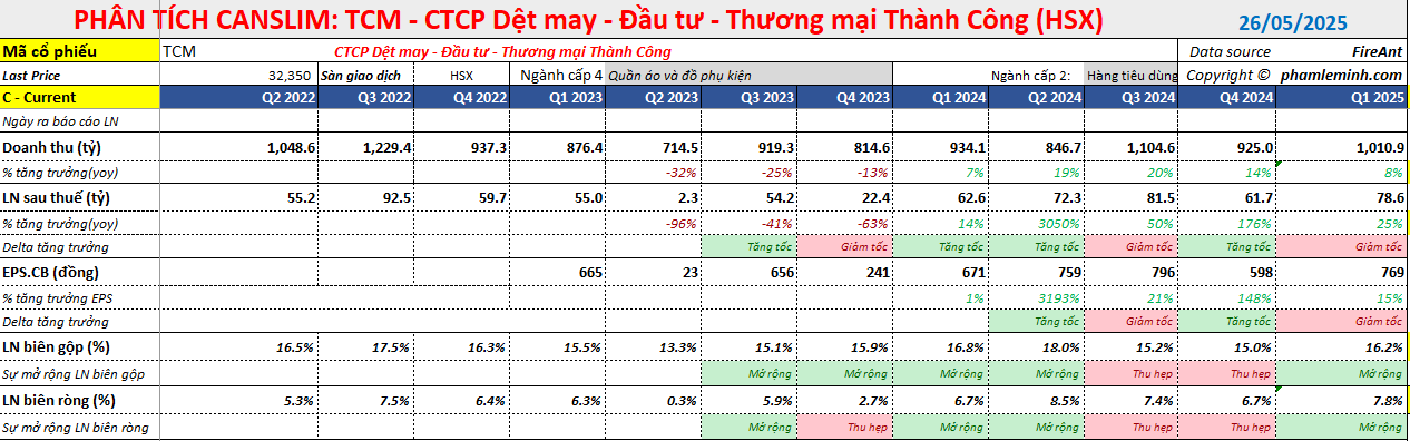 Trong Quý 1/2025, TCM đạt doanh thu thuần 1,011 tỷ đồng (+8% YoY) và lợi nhuận ròng 78 tỷ đồng (+26% YoY), sát với dự báo của HSC. Lợi nhuận ròng tăng mạnh nhờ tỷ lệ chi phí bán hàng & quản lý/doanh thu giảm đáng kể (từ 9% xuống 7.3%), bù đắp cho việc tỷ suất lợi nhuận gộp giảm nhẹ (từ 16,8% xuống 16,2%).