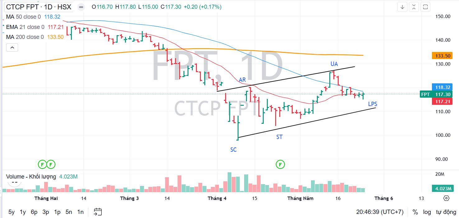 Trên đồ thị, RS của FPT hiện tại khoảng 26, nằm trong số các cổ phiếu hoạt động kém trên thị trường. FPT đang tích lũy trong một kênh giá hướng lên, và quanh MA50 ngày. Nhóm ngành công nghệ vẫn chưa nhận được sự ưa thích của dòng tiền do họ vẫn còn băn khoăn về định giá sau các sự kiện như DeepSeek hay ảnh hưởng chiến tranh thương mại đến ngành công nghệ nói chung và trí tuệ nhân tạo.