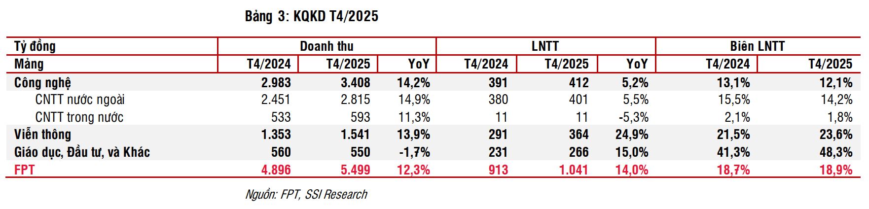 Lũy kế 4 tháng đầu năm 2025, FPT đạt doanh thu 21,600 tỷ đồng (+13.5% yoy) và LNST 3,500 tỷ đồng (+18.5% YoY). Kết quả này thấp hơn dự báo của các SSI, chủ yếu do tăng trưởng tại thị trường Châu Á Thái Bình Dương (trừ Nhật Bản) yếu hơn dự kiến.