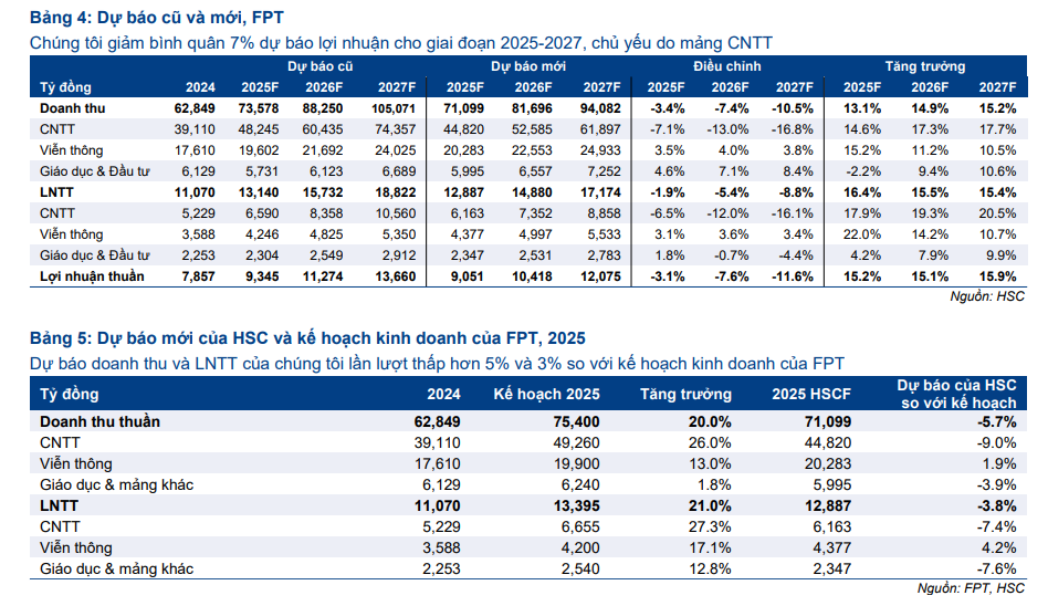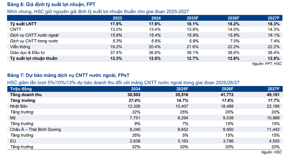 Tương tự, nhằm phản ánh mối lo ngại về sức chi tiêu cho lĩnh vực CNTT tại thị trường Châu Á – Thái Bình Dương và Mỹ, HSC đã điều chỉnh giảm bình quân 7% dự báo lợi nhuận ròng giai đoạn 2025-2027 của FPT.