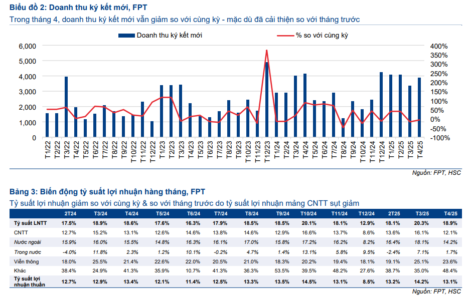 Doanh thu mới ký kết vẫn chưa có dấu hiệu phục hồi, chỉ tăng khiêm tốn 10% yoy trong 4 tháng đầu năm 2025 đạt 15,400 tỷ đồng, nhưng giảm 6%yoy trong tháng 4 (3,879 tỷ đồng, nhưng tăng 15.5% mom). Đà tăng trong 4 tháng đầu năm 2025 chậm lại phản ánh những bất ổn liên quan đến tình hình kinh tế và địa chính trị toàn cầu, tác động đến các quyết định chi tiêu cho lĩnh vực CNTT của doanh nghiệp