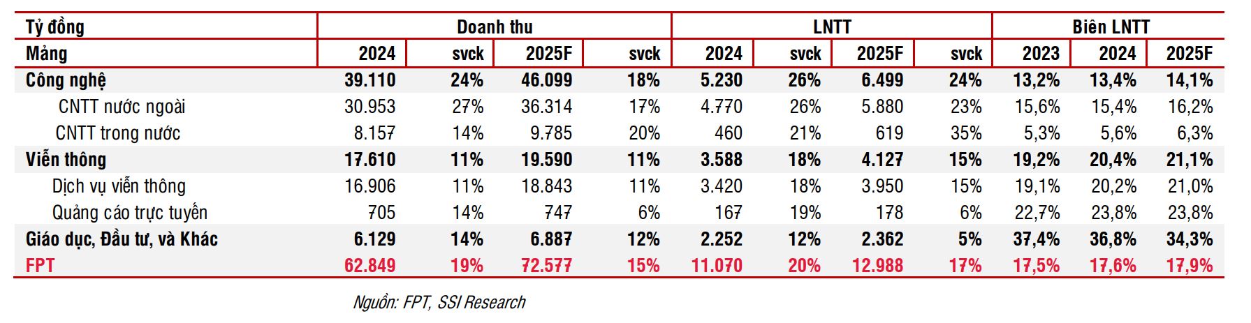 FPT đặt kế hoạch doanh thu và NPATMI năm 2025 lần lượt đạt 72,600 tỷ đồng (+15% YoY) và 9,300 tỷ đồng (+18% YoY).
