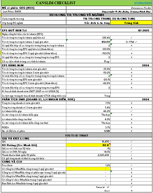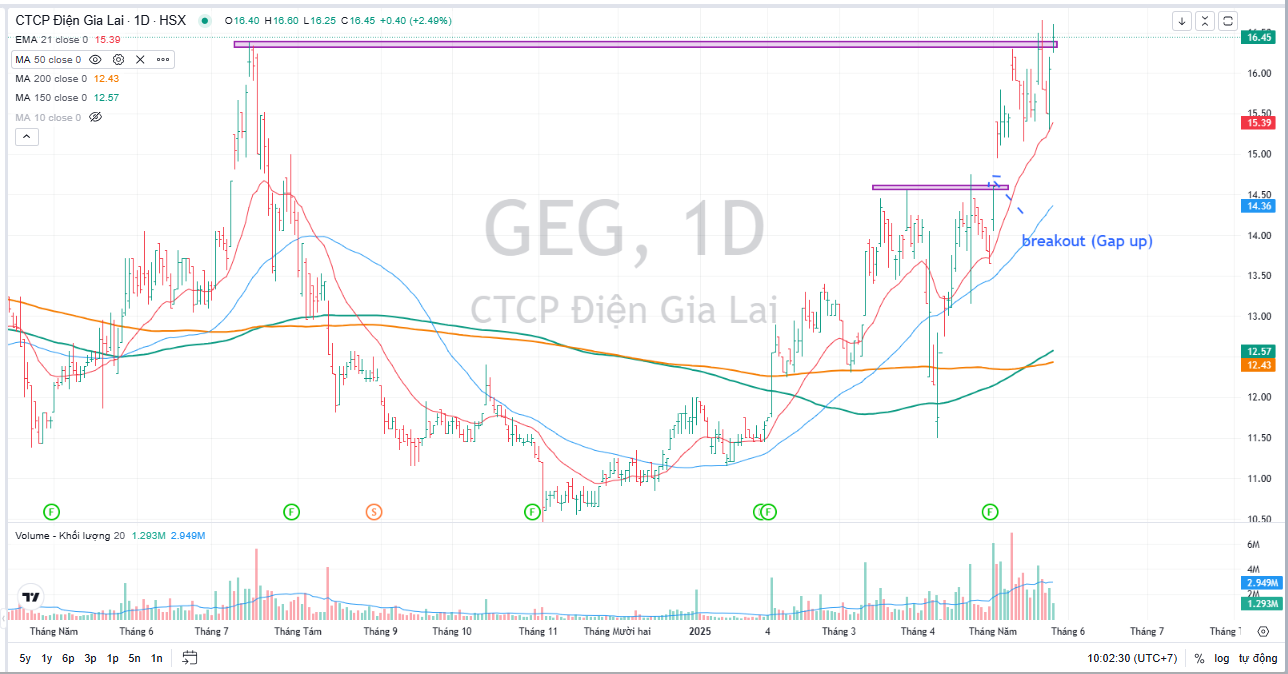 Trên đồ thị RS=92, nằm trong số cổ phiếu hoạt động tốt trên thị trường. Tuy nhiện, sau khi breakout bằng Gap Up từ ngày 6.5.2025, GEG đã trở lại đỉnh cũ hồi tháng 7.2024 và gặp phải kháng cự tại đây.