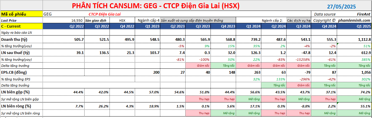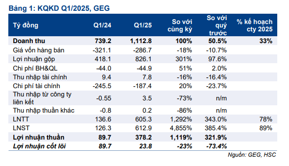 Trong Quý 1/2025, GEG ghi nhận doanh thu ấn tượng đạt 1,112 tỷ đồng (+50% YoY) và lợi nhuận sau thuế (LNST) tăng vọt lên 613 tỷ đồng (+386% YoY).