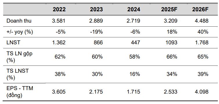 - VCBS (25.5.2025): Ước tính doanh thu 2025 đạt 3,209 tỷ đồng (+18% YoY) và lợi nhuận sau thuế 1,093 tỷ đồng (+144% YoY), tương ứng EPS 2,533 đồng/cổ phiếu. VCBS đưa ra khuyến nghị MUA với giá hợp lý là 33,773 VNĐ/cổ phiếu.