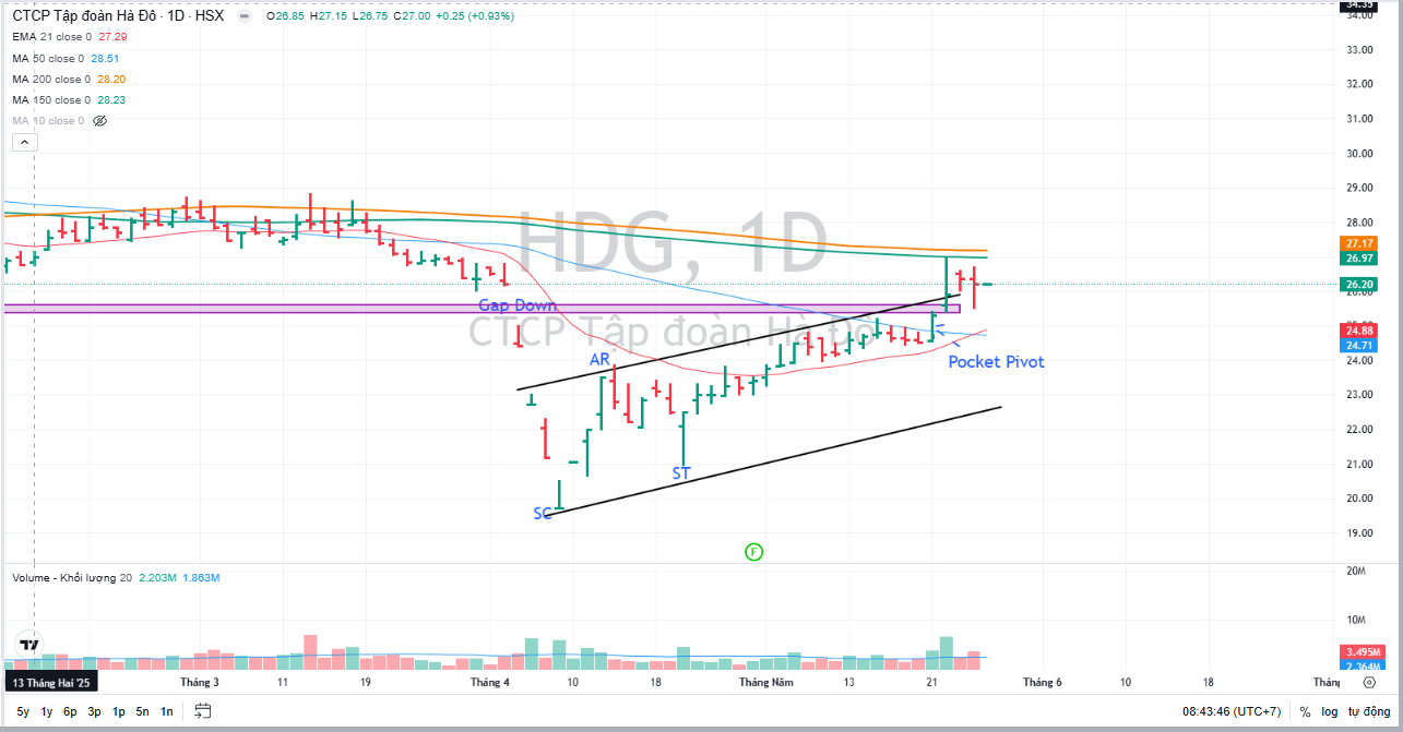 Ngày 21.5.2025, HDG có điểm mua Pocket Pivot.