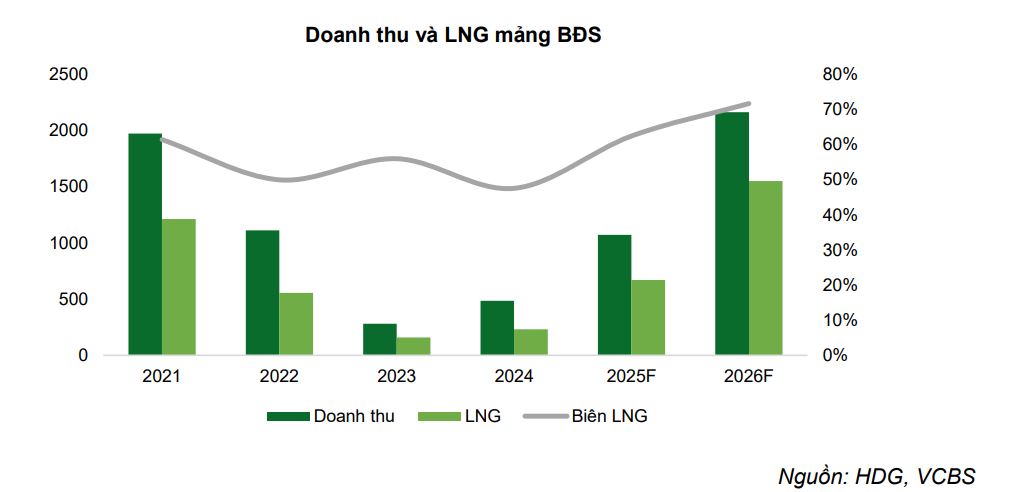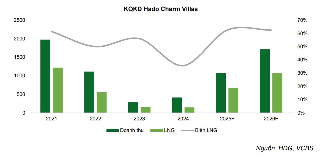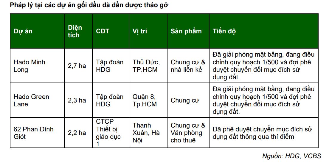 - Pháp lý các dự án gối đầu dần được tháo gỡ: Sau khi Hà Nội công bố danh sách các dự án đủ điều kiện tháo gỡ (bao gồm dự án Phan Đình Giót của HDG), VCBS kỳ vọng TP. Hồ Chí Minh cũng sẽ sớm đưa ra danh sách tương tự trong năm 2025, giúp tháo gỡ vướng mắc cho các dự án trọng điểm như Hado Minh Long và Hado Green Lane. Đây là những dự án nằm ở khu vực trung tâm TP.HCM với quỹ đất khan hiếm, hứa hẹn sẽ mang lại doanh số tích cực và dòng tiền quan trọng từ năm 2026 trở đi, bổ sung cho Charm Villas khi dự án này dần hoàn tất bàn giao.