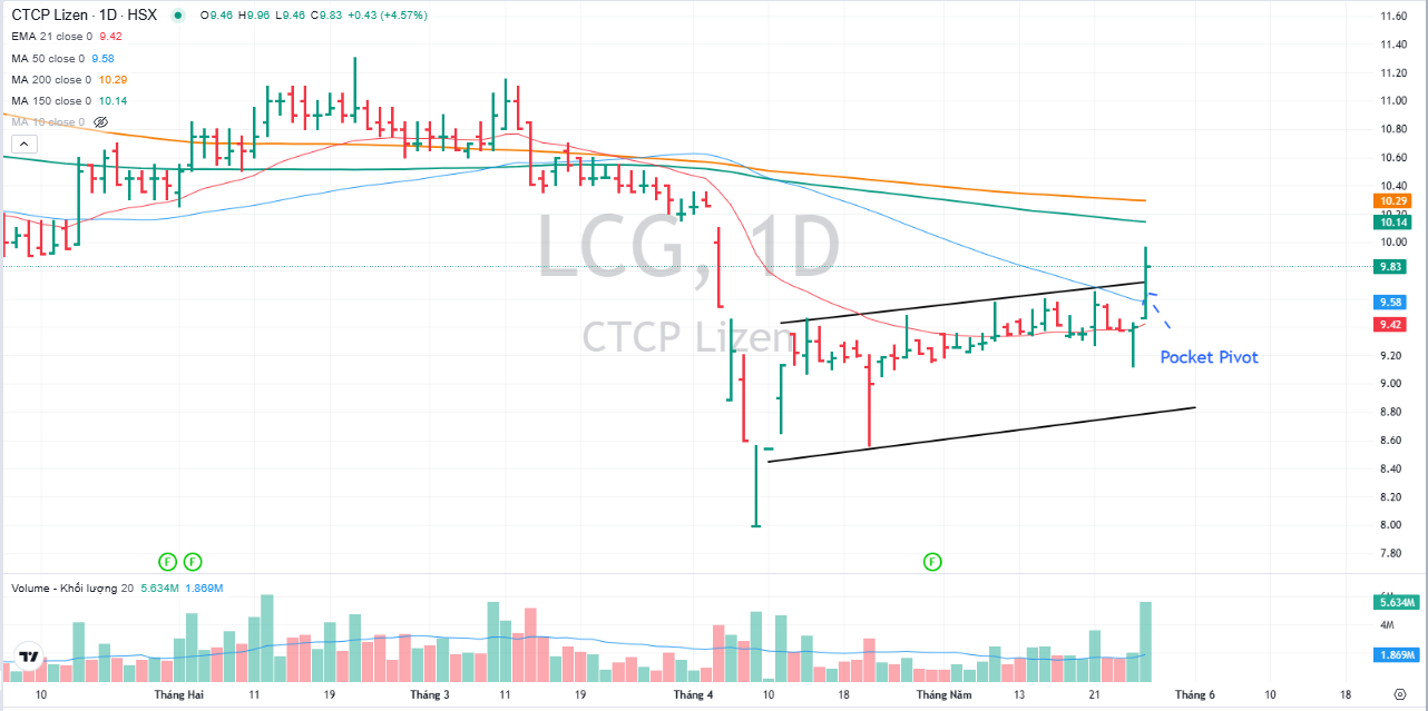 Elibook đánh giá LCG yếu hơn so với các cổ phiếu dẫn dắt như VCG hay HHV. Trên đồ thị, RS của LCG là 26, nằm trong số các cổ phiếu hoạt động khá kém trên thị trường. Tuy nhiên, với sóng ngành đầu tư công lan tỏa, ngày 27.5.2025, LCG có điểm mua Pocket Pivot.