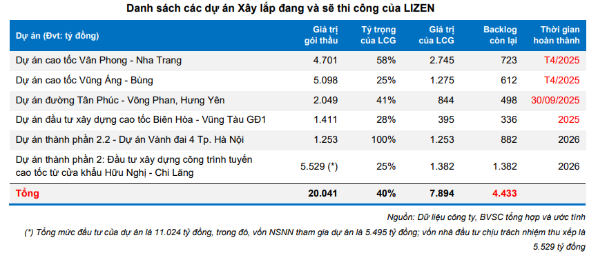 - Backlog “dồi dào” và chất lượng cao: Theo ước tính của BVSC, backlog còn lại của LCG là 4,433 tỷ đồng (tính trên 6 dự án chủ đạo), gấp 1.6 lần doanh thu thuần năm 2024. Điều đáng chú ý là cả 6/6 dự án này đều là các dự án quốc gia, với 4/6 dự án dự kiến hoàn thành trong năm 2025, ước tính khoảng 2,169 tỷ đồng doanh thu. Hai dự án trọng điểm khác là Vành đai 4 Hà Nội (Thành phần 2.2) và Cao tốc cửa khẩu Hữu Nghị – Chi Lăng cũng đang được đẩy nhanh tiến độ, đóng góp đáng kể vào doanh thu của LCG trong năm 2025.