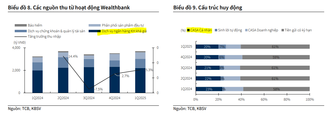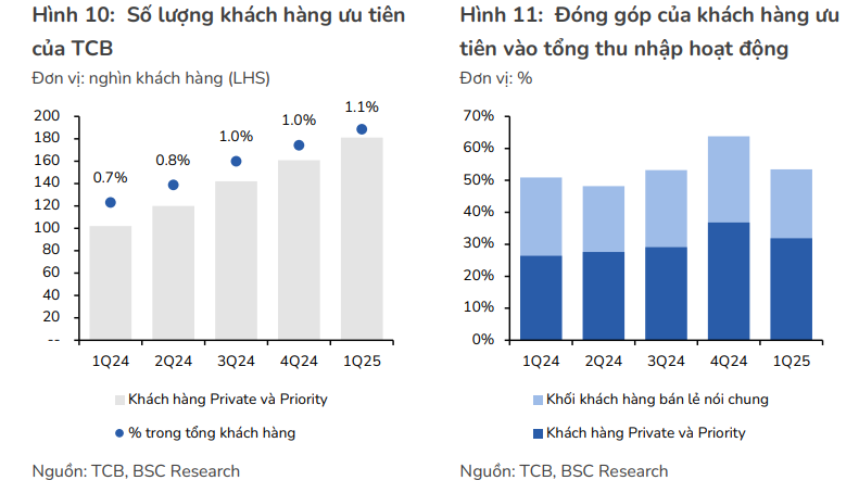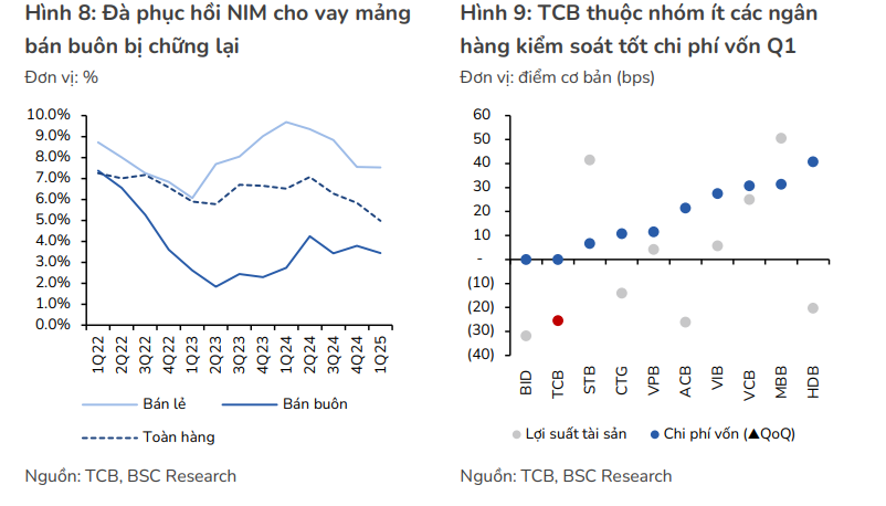 - Kiểm soát tốt chi phí vốn và NIM: TCB tiên phong với các sản phẩm huy động như “Sinh lời tự động” và CD Bảo Lộc, giúp kiểm soát tốt chi phí vốn (CoF) và duy trì tỷ lệ CASA ở mức cao (39.4% cuối Q1/2025). BSC kỳ vọng CASA có thể quay về mốc 40% trong 2025 và 50% trong trung hạn. Dù NIM chịu áp lực cạnh tranh, TCB được kỳ vọng sẽ kiểm soát đà giảm tốt hơn các ngân hàng khác và duy trì NIM trên 4% (KBSV).