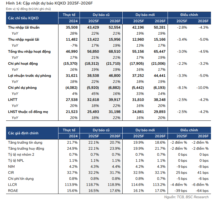 - BSC (20.5.2025): Khuyến nghị NẮM GIỮ với giá mục tiêu cập nhật là 33,100 đồng/cp . BSC cho rằng TCB có vị thế thuận lợi để cải thiện NIM khi thị trường BĐS phục hồi và định giá hiện tại (P/B 1 năm = 1.3x) chưa hoàn toàn tương xứng với triển vọng. BSC điều chỉnh giảm nhẹ lần lượt 2.5% và 4.2% đối với dự báo LNTT 2025F và 2026F của TCB xuống 31,800 nghìn tỷ (+16% YoY) và 38,200 tỷ (+20% YoY)