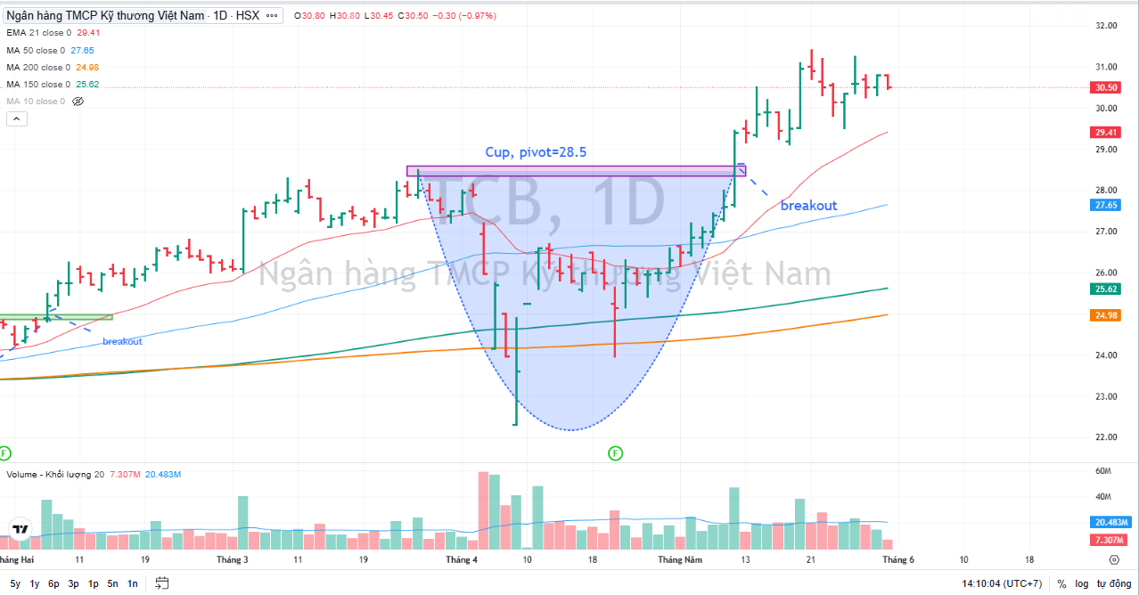 Trên đồ thị, TCB đang điều chỉnh về EMA 21 ngày, tìm kiếm điểm hỗ trợ sau khi breakout mẫu hình Chiếc Cốc. Nhà đầu tư sau khi được khuyến nghị giảm bớt tỷ trọng ở TCB ở điểm breakout sẽ bắt đầu tìm kiếm điểm mua trở lại ở những phiên điều chỉnh.