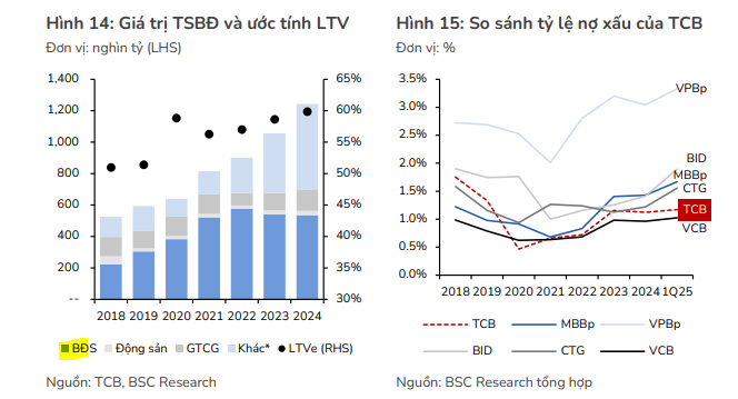 - Chất lượng tài sản được kiểm soát: Mặc dù nợ xấu bán lẻ tăng, TCB vẫn nằm trong nhóm các ngân hàng có chất lượng tài sản tốt với NPL ở mức thấp so với toàn ngành. Bộ đệm dự phòng LLCR cao (gần 112% cuối Q1) và giá trị tài sản đảm bảo lớn (chủ yếu là BĐS pháp lý rõ ràng) giúp TCB kiểm soát chi phí tín dụng và tỷ lệ nợ xấu theo kế hoạch.