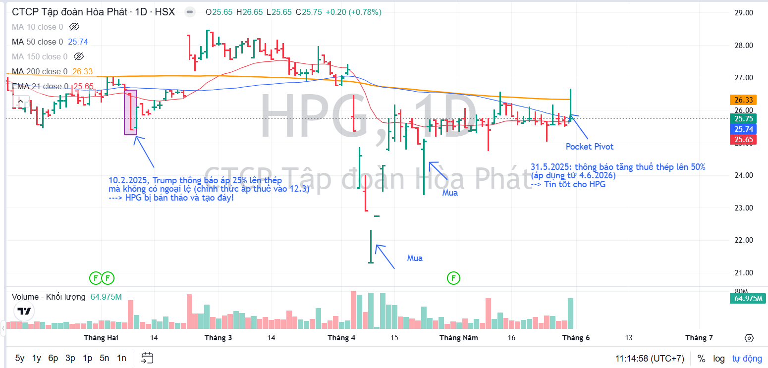Cổ phiếu HPG từng có phiên bán mạnh vào ngày 10.2.2025 khi ông Trump thông báo áp thuế 25% lên mặt hàng thép và nhôm mà không có ngoại lệ. Sự bán tháo này là do nhà đầu tư hoảng loạn không hiểu tác động thế nào. Nhưng sau đó, giá cổ phiếu hồi phục, các CTCK dần ra nhiều bài phân tích hơn, giải thích việc hưởng lợi của HPG khi Mỹ áp thuế lên mặt hàng thép.