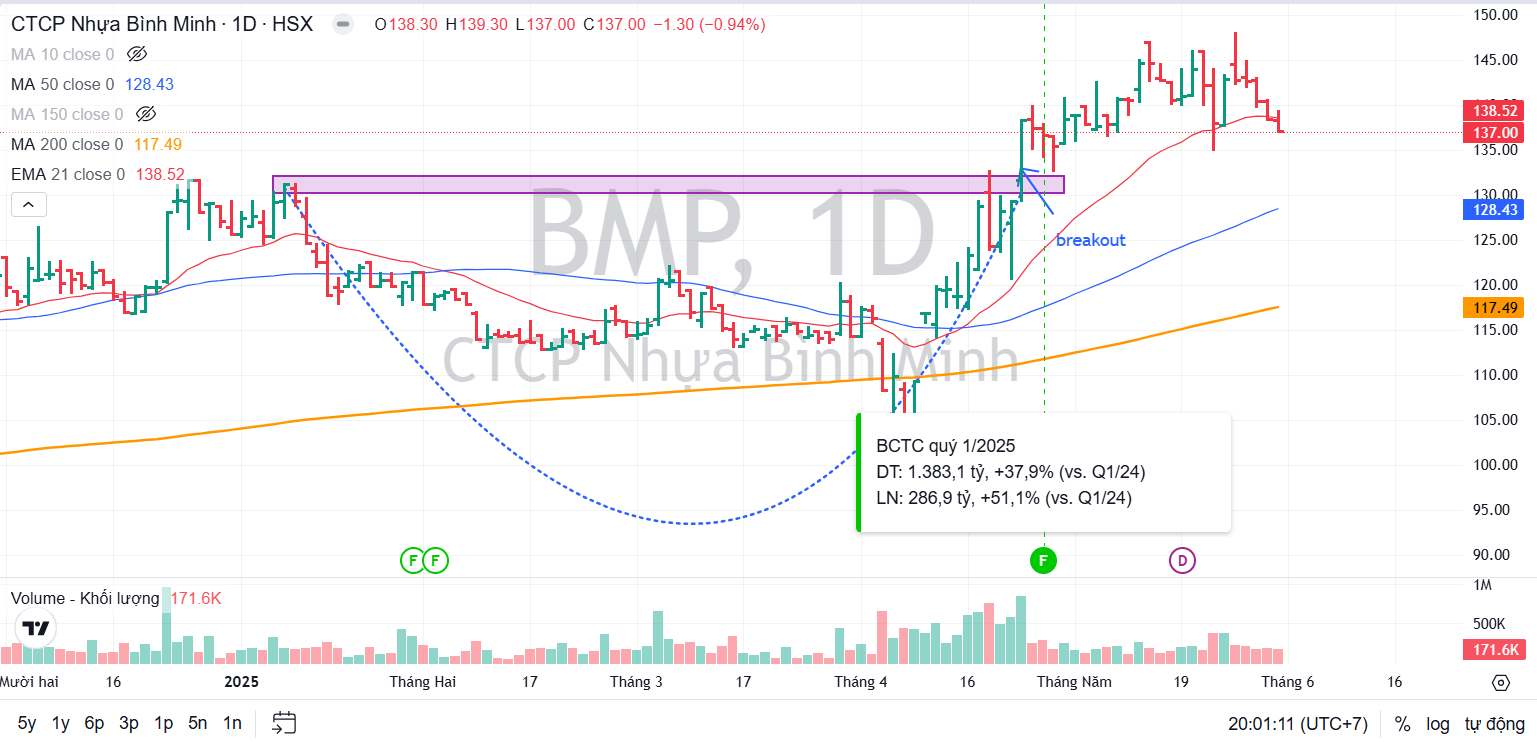 Sau khi breakout mẫu hình Chiếc Cốc vào ngày 23.4.2025, trước thời điểm công bố lợi nhuận ròng quý 1 tăng 51.1% yoy, cổ phiếu BMP đang thoái lùi tìm kiếm hỗ trợ tại EMA 21 ngày. Elibook Team cho rằng, nhà đầu tư nên tìm kiếm cơ hội mua khi cổ phiếu tiến về vùng giữa EMA 21 ngày và MA50 ngày.