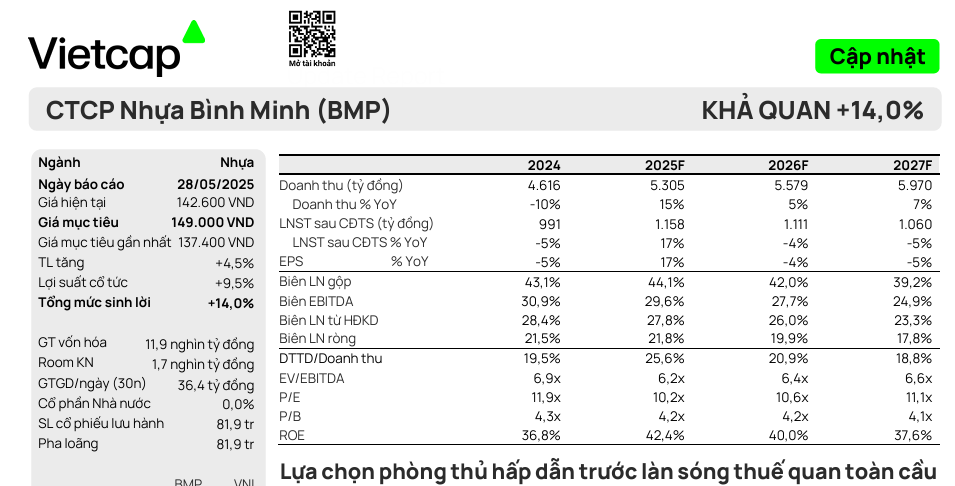 Mặc dù giá cổ phiếu BMP đã tăng 24% trong 3 tháng qua, Vietcap (28.5.2025) điều chỉnh khuyến nghị từ MUA xuống KHẢ QUAN, nhưng vẫn tăng 8% giá mục tiêu lên 149,000 đồng/cổ phiếu.