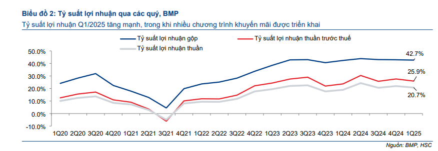 HSC (29.4.2025) duy trì khuyến nghị NẮM GIỮ với giá mục tiêu 134,700đ. HSC lưu ý P/E trượt dự phóng 1 năm của BMP là 11.1 lần, cao hơn so với bình quân 5 năm ở mức 9.2 lần, nhưng vẫn nhấn mạnh lợi suất cổ tức cao (bình quân 9% trong 3 năm tới) là yếu tố hỗ trợ. HSC cũng tỏ ra thận trọng hơn một chút với các chính sách quản lý mới do việc thay đổi CEO có hiệu lực từ ngày 1/6/2025.